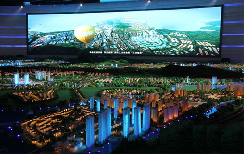 首先將城市的所有(建筑、交通、環(huán)境)制作成三維動畫內容;其次用制作好的沙盤模型展示城市的風貌,然后利用投影機將三維動畫內容投射到屏幕上,大屏幕在播放的同時,實體沙盤模型也會同步配合展示,呈現(xiàn)出震撼的視覺效果。