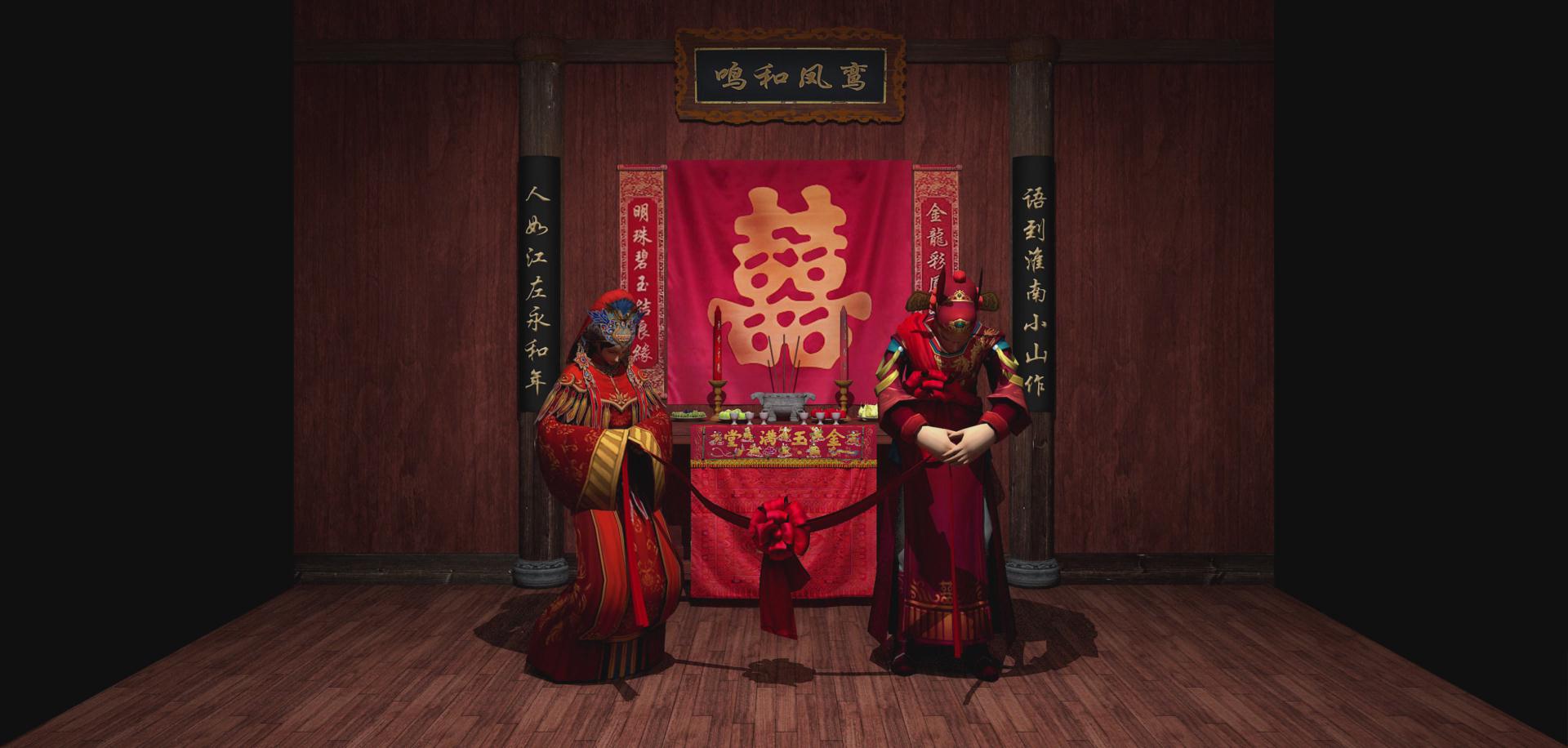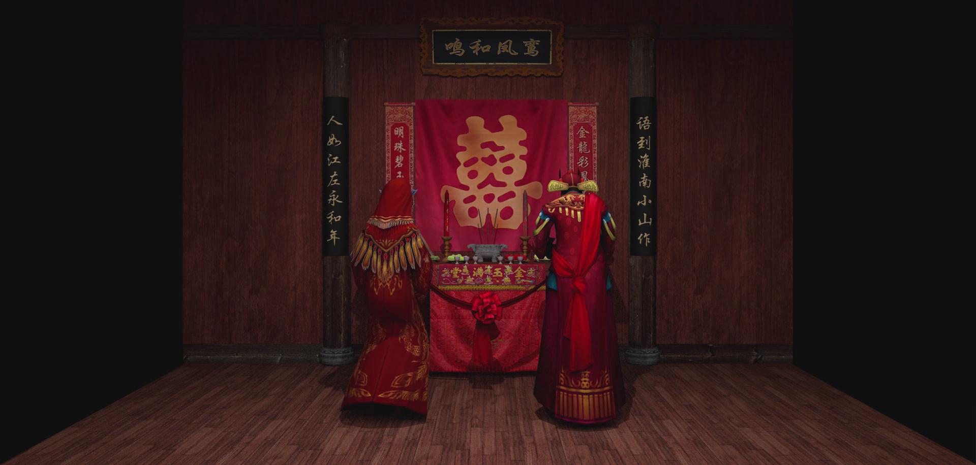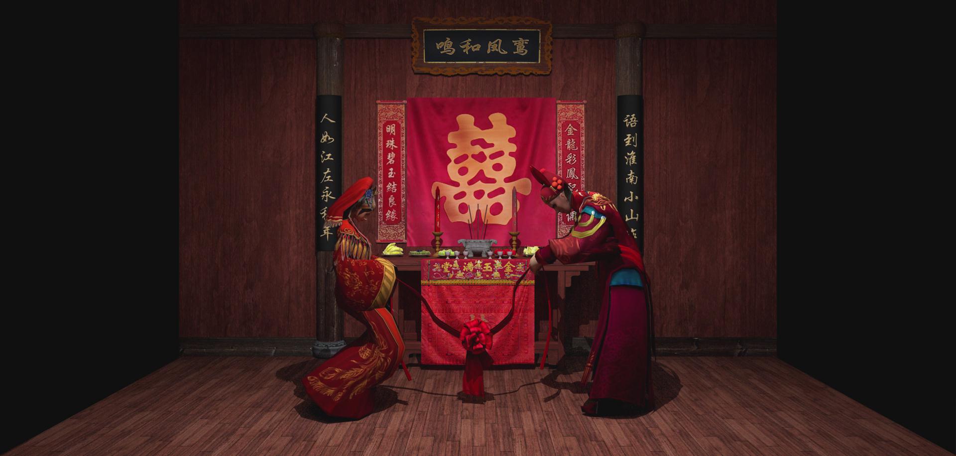 漢族先人認為黃昏是吉時,所以會在黃昏行娶妻之禮,因此夫妻結合的禮儀稱為“昏禮”,后來演化為婚禮。漢族人認為紅是吉祥的象征,所以傳統婚禮習俗總以大紅色烘托著喜慶、熱烈的氣氛。吉祥、祝福、孝敬成為婚禮上的主旨,幾乎婚禮中的每一項禮儀都滲透著中國人的哲學思想。影片描述了漢族傳統婚俗拜堂過程,先是燃炮后是拜堂,體現了中國傳統文化的精髓。